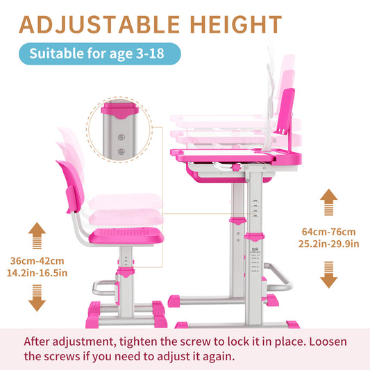 Kids Study Desk and Chair Set, LVYUAN Height Adjustable Children School Study Drawing Desk, Ergonomic Kids Table Desk and Chair Set with Storage Drawer, Hook, Bracket, Pen Slot for Ages 3-18 Pink