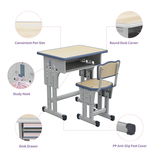 Kids Study Desk and Chair Set, LVYUAN Children School Study Drawing Desk Chair Height Adjustable Kids Table Desk and Chair Set with Storage Drawer, Hook Gray
