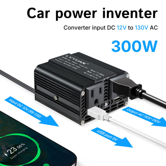 LVYUAN 300W Modified Sine Wave Power Inverter 12V DC to 110V AC Vehicles Converter 2 AC Outlets + 2USB Charger Car Plug Adapter for Laptop, Computer, Car, RV, Camping & Home Black