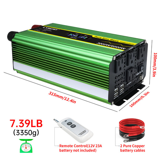 LVYUAN 3000W 6000W Pure Sine Wave Power Inverter DC 12V to AC 110V 120V Car Converter 4 AC Outlets + 4 USB LCD Display with Remote Control for Car, RV, Camping & Home Backup Green