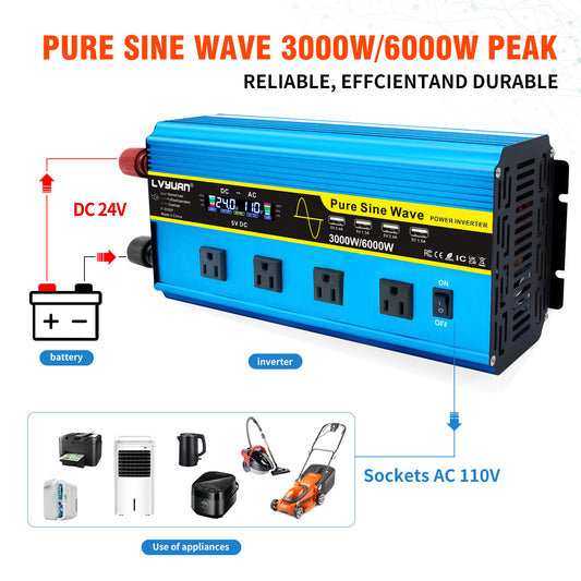 LVYUAN 3000W 6000W Pure Sine Wave Power Inverter DC 24V to AC 110V 120V Car Converter 4 AC Outlets + 4 USB LCD Display with Remote Control for Car, RV, Camping & Home Backup Blue