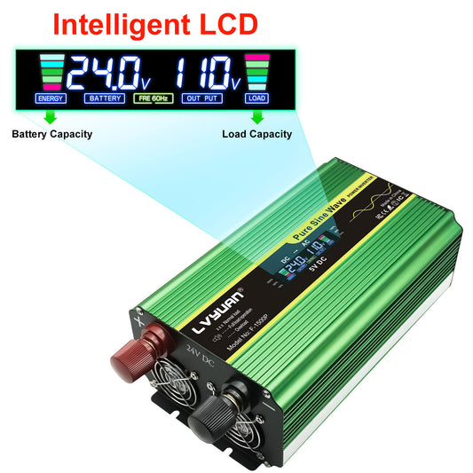 LVYUAN 3000W 6000W Pure Sine Wave Power Inverter DC 24V to AC 110V 120V Car Converter 4 AC Outlets + 4 USB LCD Display with Remote Control for Car, RV, Camping & Home Backup Green