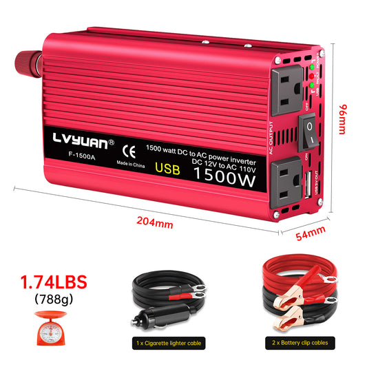 LVYUAN 1500 Watts Peak Power Inverter Modified Sine Wave DC 12V to AC 110V 120V Car Converter 2 AC Outlets + USB Adapter USB Charger for Car, RV, Camping & Home Backup Red