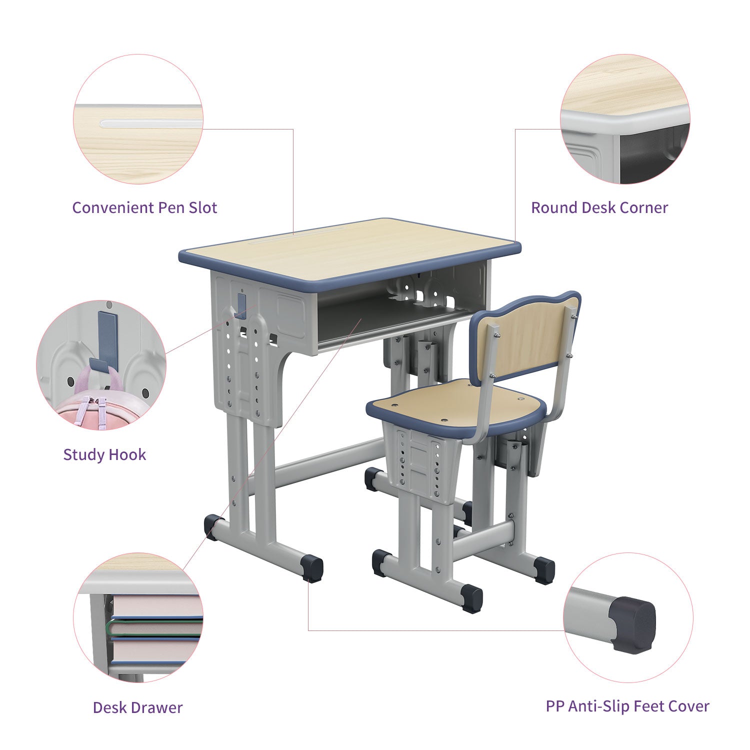 Height Adjustable: Both the heights of our kids study desk and chair set can be adjusted to adapt to kids' growing. Ergonomic Designed: Ergonomic children study drawing desk chair, effectively keep your children seated correctly and prevent humpback, allowing your child to have good and healthy posture, but also protects the eyesight with the book-stand. Environmentally Friendly and High Quality Material: Durable Construction, high quality metal and high density board material, durable and wear-resistant. Polished craftsmanship: Polished craftsmanship, smooth desktop, comfortable to use and easy to clean. PP anti-slip feet, guarantee stability and prevent wobbling. Large Storage Space: Spacious drawer, provide ample storage space for books, stationery and other school supplies. Hook design: Hook design, strong load-bearing capacity, convenient for hanging school bags. Versatile Use: Ideal for use in classrooms, tutoring centers, or home environments, this desk and chair set is suitable for both individual and group. Perfect for most Occasions: Perfect for children's rooms, study areas and more. The perfect partner for your children’ learning and best gift for your kids!