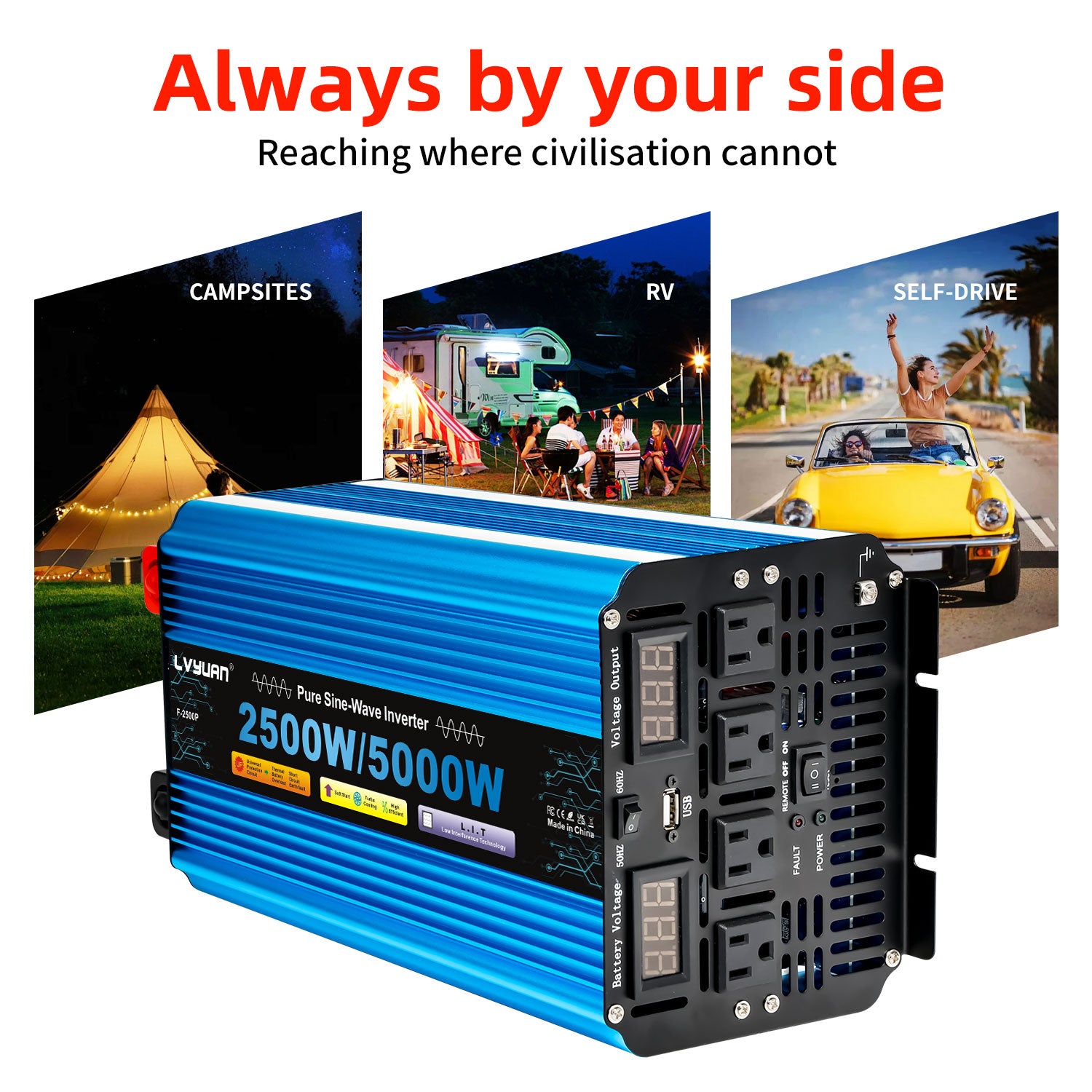 High Power Output Power Inverter: Delivers continuous 2500W power with a peak surge capacity of 5000W with 92% efficiency, capable of handling heavy-duty appliances and tools. Pure Sine Wave Technology: Ensures safe and efficient operation of sensitive electronics like laptops, TVs, and kitchen appliances. Dual Frequency Selection (60Hz/50Hz): Adaptable to different power grid frequencies, expanding its usability. Multiple Connectivity Options: Equipped with 4 AC outlets and a 5V 3.1A USB port, allowing you to charge multiple devices simultaneously. Smart Protection Systems: High-power inverter is equipped with ground wire to ensure safety. Includes overload, short circuit, overheat, under/over voltage protection, and a temperature-controlled cooling fan to ensure long-lasting performance. User-Friendly Remote Controls: Comes with a remote control for easy on/off operation and an LED display that shows input/output voltages, keeping you informed about the inverter's status at all times. Compact and Portable Design: Lightweight and easy to transport, perfect for outdoor adventures or emergency backups.