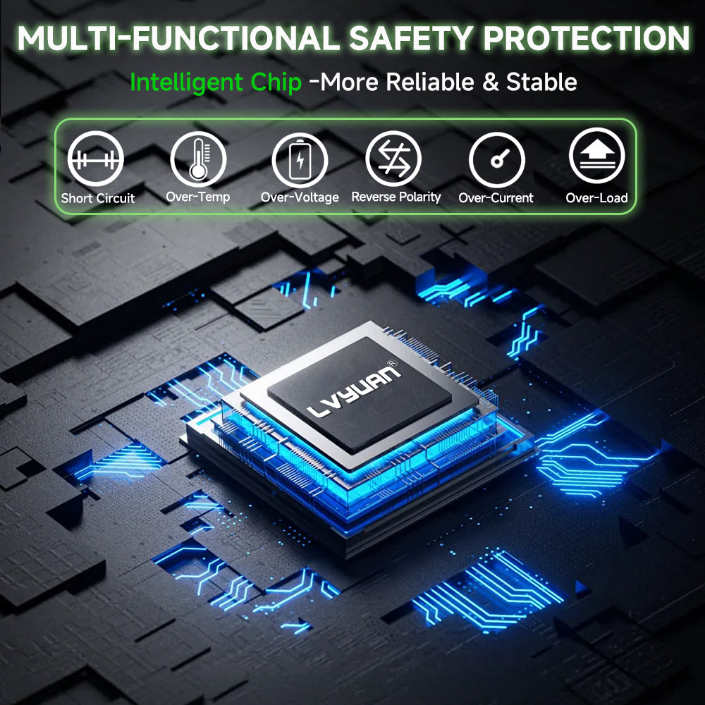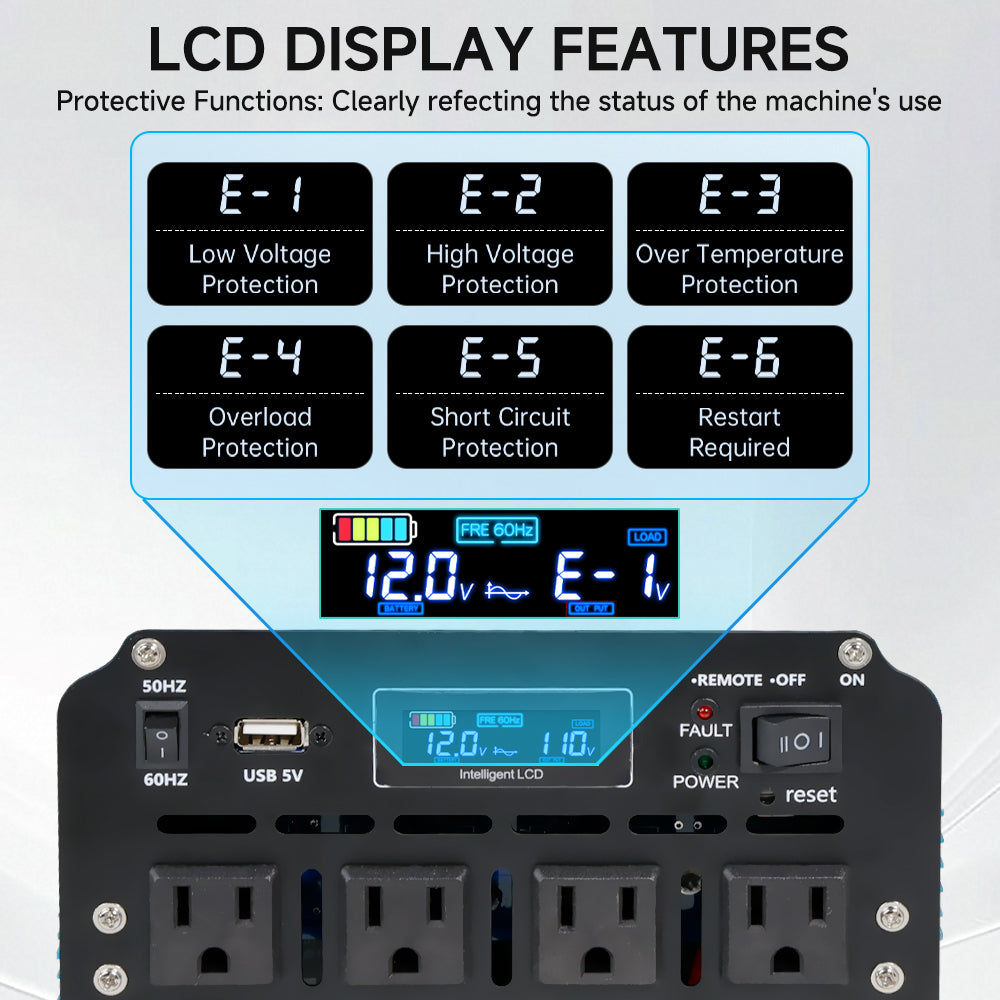 High Power Output Power Inverter: Delivers continuous 4000W power with a peak surge capacity of 8000W with 92% efficiency, capable of handling heavy-duty appliances and tools. Pure Sine Wave Technology: Ensures safe and efficient operation of sensitive electronics like laptops, TVs, and kitchen appliances. Dual Frequency Selection (60Hz/50Hz): Adaptable to different power grid frequencies, expanding its usability. Multiple Connectivity Options: Equipped with 4 AC outlets and a 5V 3.1A USB port, allowing you to charge multiple devices simultaneously. Smart Protection Systems: High-power inverter is equipped with ground wire to ensure safety. Includes overload, short circuit, overheat, under/over voltage protection, and a temperature-controlled cooling fan to ensure long-lasting performance. User-Friendly Remote Controls: Comes with a remote control for easy on/off operation and an LCD display that shows input/output voltages, keeping you informed about the inverter's status at all times. Compact and Portable Design: Lightweight and easy to transport, perfect for outdoor adventures or emergency backups.