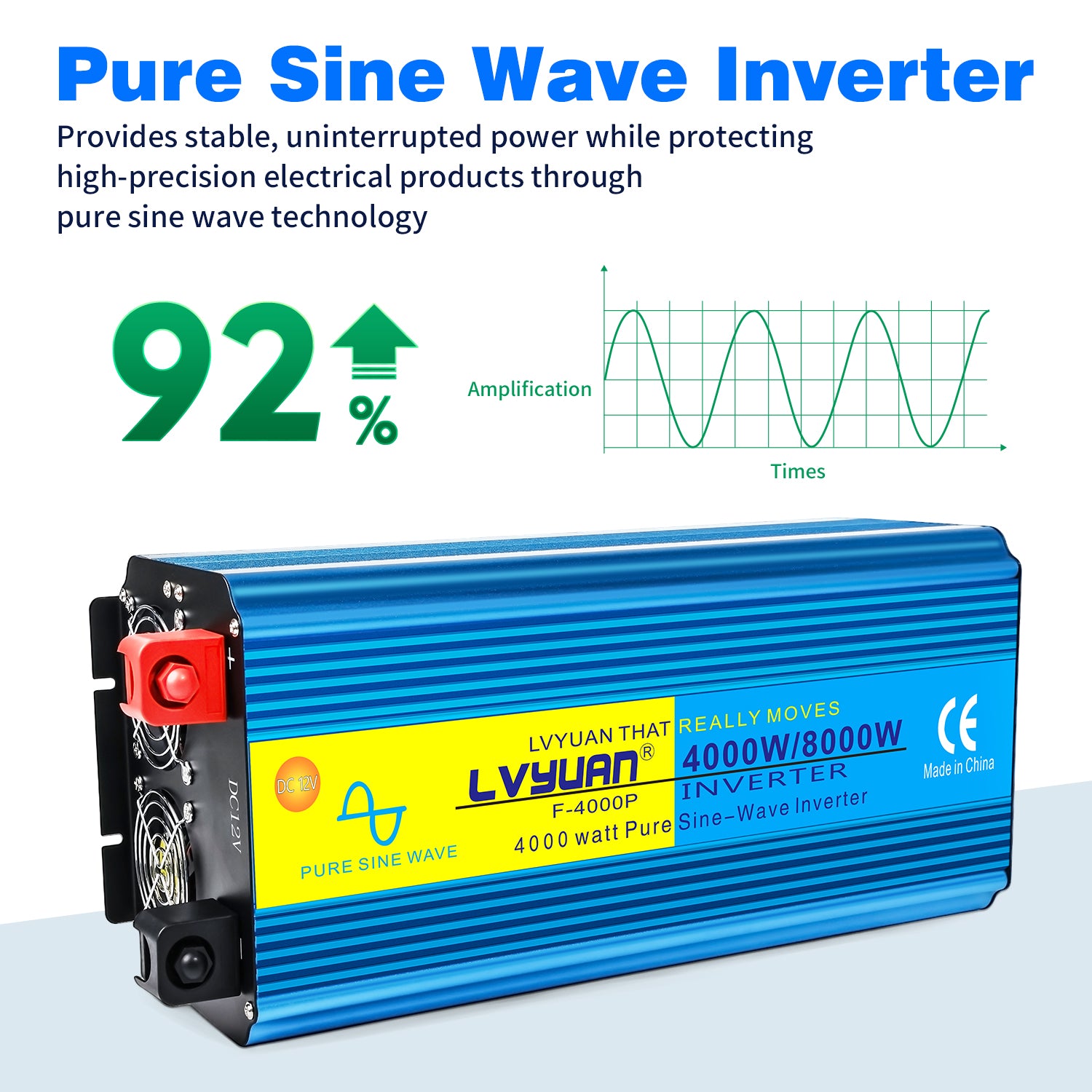 High Power Output Power Inverter: Delivers continuous 4000W power with a peak surge capacity of 8000W with 92% efficiency, capable of handling heavy-duty appliances and tools. Pure Sine Wave Technology: Ensures safe and efficient operation of sensitive electronics like laptops, TVs, and kitchen appliances. Dual Frequency Selection (60Hz/50Hz): Adaptable to different power grid frequencies, expanding its usability. Multiple Connectivity Options: Equipped with 4 AC outlets and a 5V 3.1A USB port, allowing you to charge multiple devices simultaneously. Smart Protection Systems: High-power inverter is equipped with ground wire to ensure safety. Includes overload, short circuit, overheat, under/over voltage protection, and a temperature-controlled cooling fan to ensure long-lasting performance. User-Friendly Remote Controls: Comes with a remote control for easy on/off operation and an LED display that shows input/output voltages, keeping you informed about the inverter's status at all times. Compact and Portable Design: Lightweight and easy to transport, perfect for outdoor adventures or emergency backups.