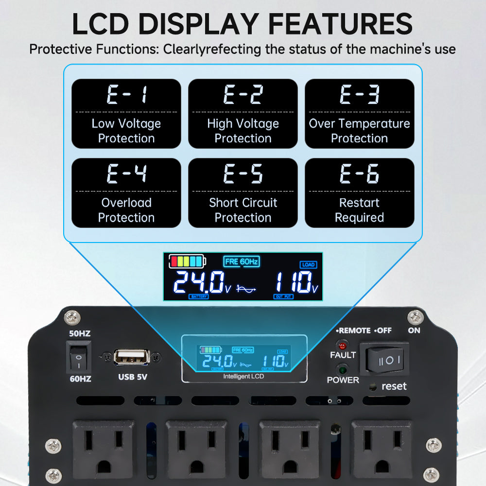High Power Output Power Inverter: Delivers continuous 4000W power with a peak surge capacity of 8000W with 92% efficiency, capable of handling heavy-duty appliances and tools. Pure Sine Wave Technology: Ensures safe and efficient operation of sensitive electronics like laptops, TVs, and kitchen appliances. Dual Frequency Selection (60Hz/50Hz): Adaptable to different power grid frequencies, expanding its usability. Multiple Connectivity Options: Equipped with 4 AC outlets and a 5V 3.1A USB port, allowing you to charge multiple devices simultaneously. Smart Protection Systems: High-power inverter is equipped with ground wire to ensure safety. Includes overload, short circuit, overheat, under/over voltage protection, and a temperature-controlled cooling fan to ensure long-lasting performance. User-Friendly Remote Controls: Comes with a remote control for easy on/off operation and an LCD display that shows input/output voltages, keeping you informed about the inverter's status at all times. Compact and Portable Design: Lightweight and easy to transport, perfect for outdoor adventures or emergency backups.