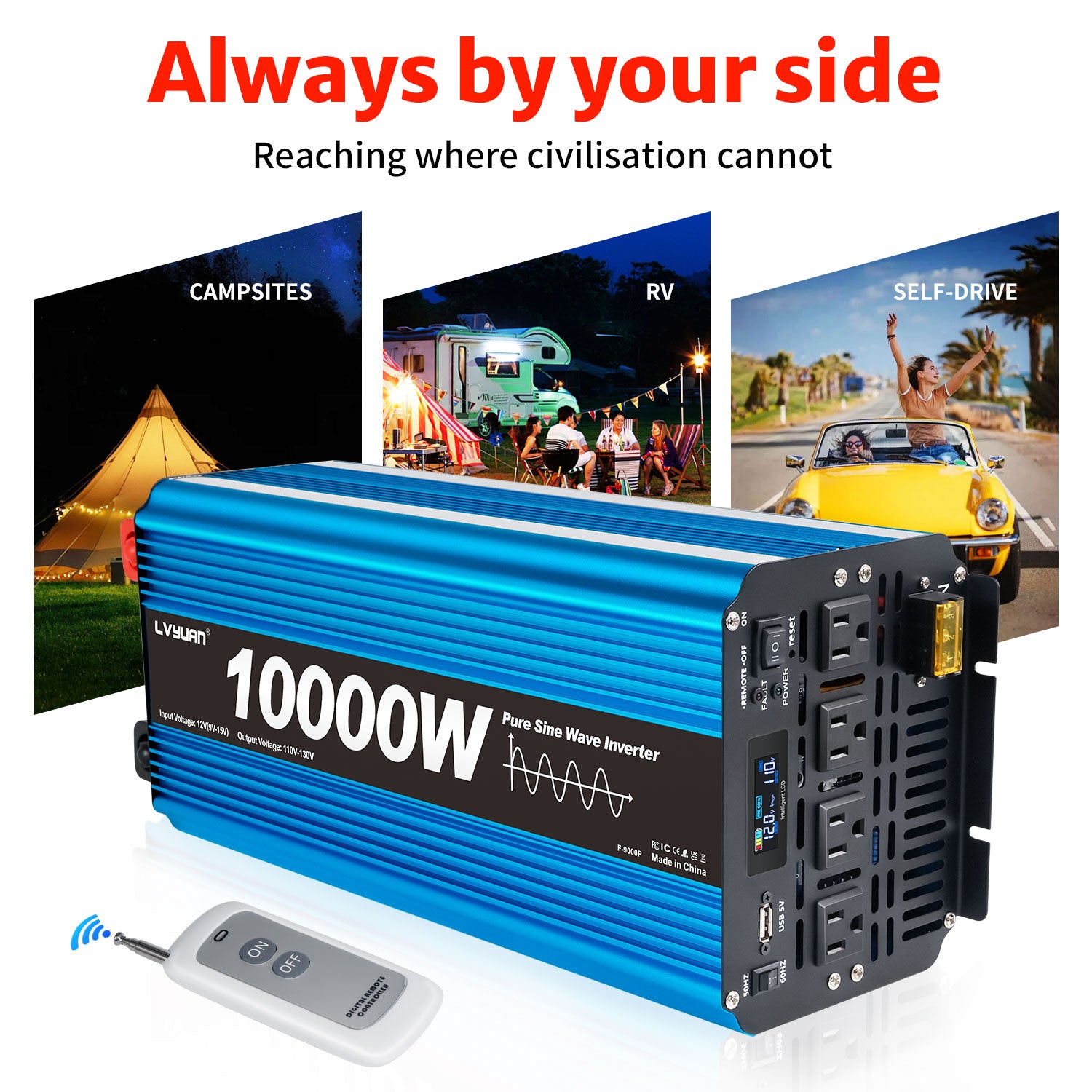 LVYUAN 5000W 10000W Peak Pure Sine Wave Power Inverter 12V DC to 110V AC Converter, 60Hz/50Hz, 4 AC Outlets + USB, LCD Display, Remote Control for Car, RV, Camping & Home Backup Blue