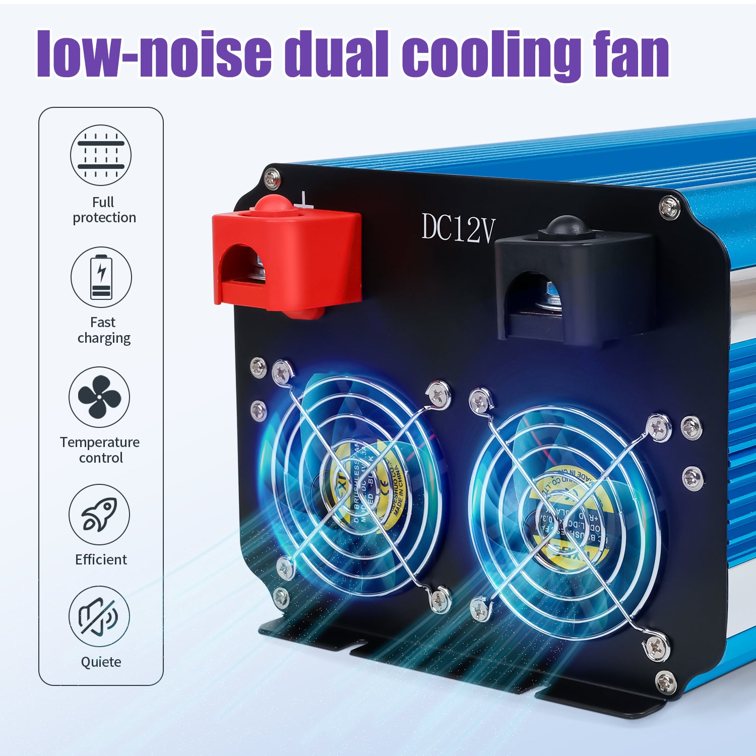 High Power Output 12V DC to 110V AC Power Inverter: Delivers continuous 5000W power with a peak surge capacity of 10000W with 92% efficiency, capable of handling heavy-duty appliances and tools. Pure Sine Wave Technology: Ensures safe and efficient operation of sensitive electronics like laptops, TVs, and kitchen appliances. Dual Frequency Selection (60Hz/50Hz): Adaptable to different power grid frequencies, expanding its usability. Multiple Connectivity Options: Equipped with 4 AC outlets and a 5V 3.1A USB port, allowing you to charge multiple devices simultaneously. Smart Protection Systems: High-power inverter is equipped with ground wire to ensure safety. Includes overload, short circuit, overheat, under/over voltage protection, and a temperature-controlled cooling fan to ensure long-lasting performance. User-Friendly Remote Controls: Comes with a remote control for easy on/off operation and an LED display that shows input/output voltages, keeping you informed about the inverter's status at all times. Compact and Portable Design: Lightweight and easy to transport, perfect for outdoor adventures or emergency backups.