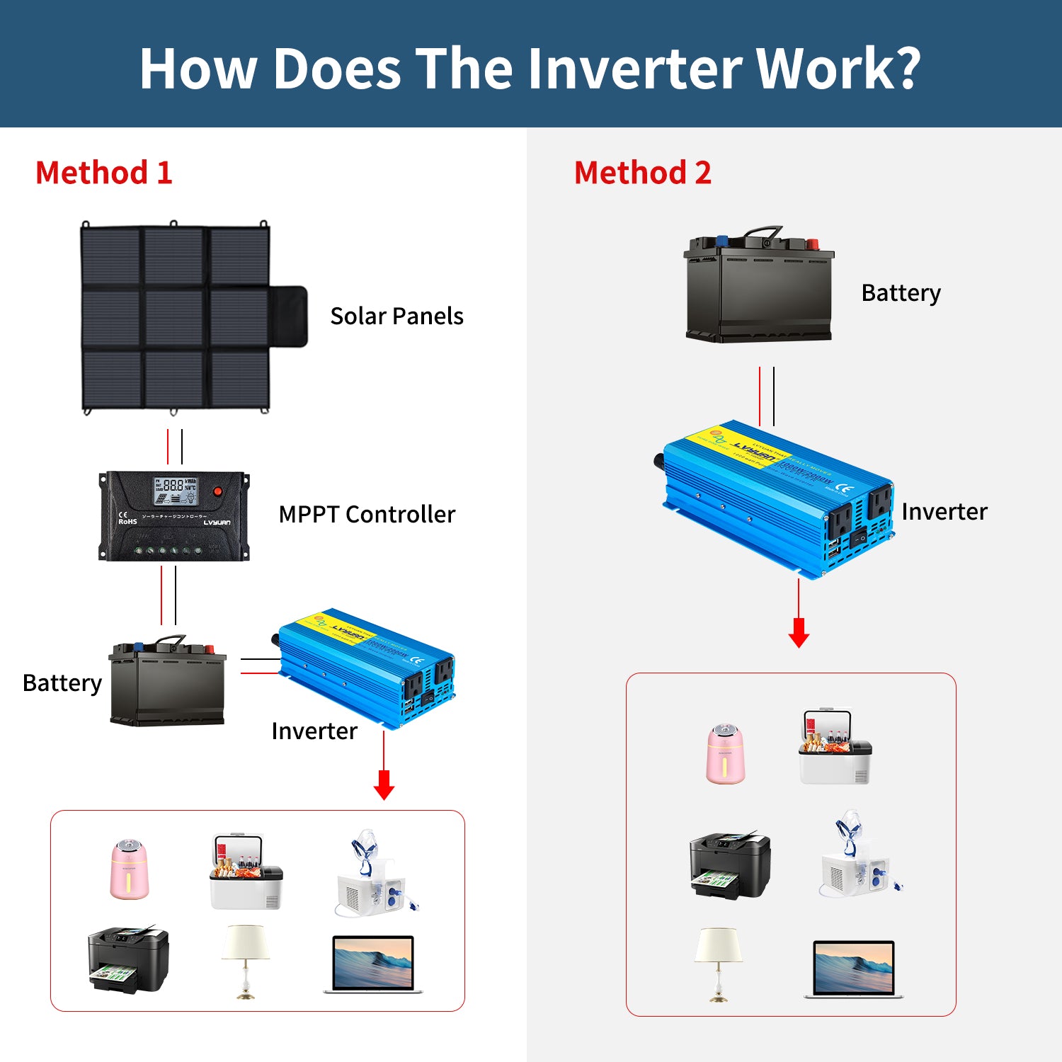 Brand New Pure Sine Wave Power Inverter DC 12V to AC 110V. Pure Sine Wave Output: Ensures optimal performance for sensitive electronics like laptops, tablets, and medical devices. 1000W Rated Power & 2000W Peak Power: 1000W continuous output power, 2000W peak surge power, convert power of DC 12V to AC 110V 120V, providing acontinuous power for a wide range of appliances & devices and handling short bursts of higher power demands. 90% Conversion Efficiency: Minimizes energy loss and maximizes battery life. Dual AC Outlets & USB Ports: Charge multiple devices simultaneously. Temperature-Controlled Cooling Fan: Keeps the inverter running cool and efficiently. Comprehensive Protection: Features overload, short circuit, overtemperature, and under/over voltage protection. Soft Start: Reduces stress on the connected devices during startup. Built-in Fuses: Provides additional safety against short circuits. Aluminum Alloy Shell: Constructed with durable aluminum alloy, this 1000watts pure sine wave power inverter provides excellent heat dissipation and is built to withstand the rigors of outdoor environments. Wide Application: LVYUAN power inverter is ideal for camping trips and road adventures, emergency preparedness kits, backup power solutions for home or office and running essential equipment when grid power is unavailable. Easy Installation: Comes with all necessary accessories for quick setup.