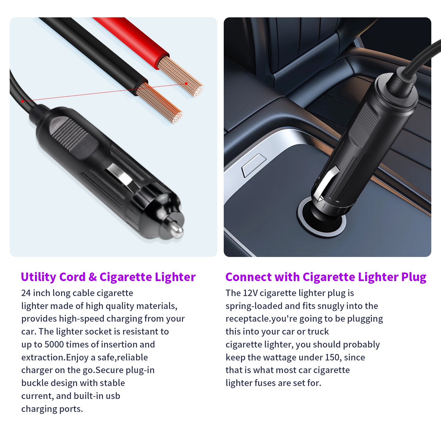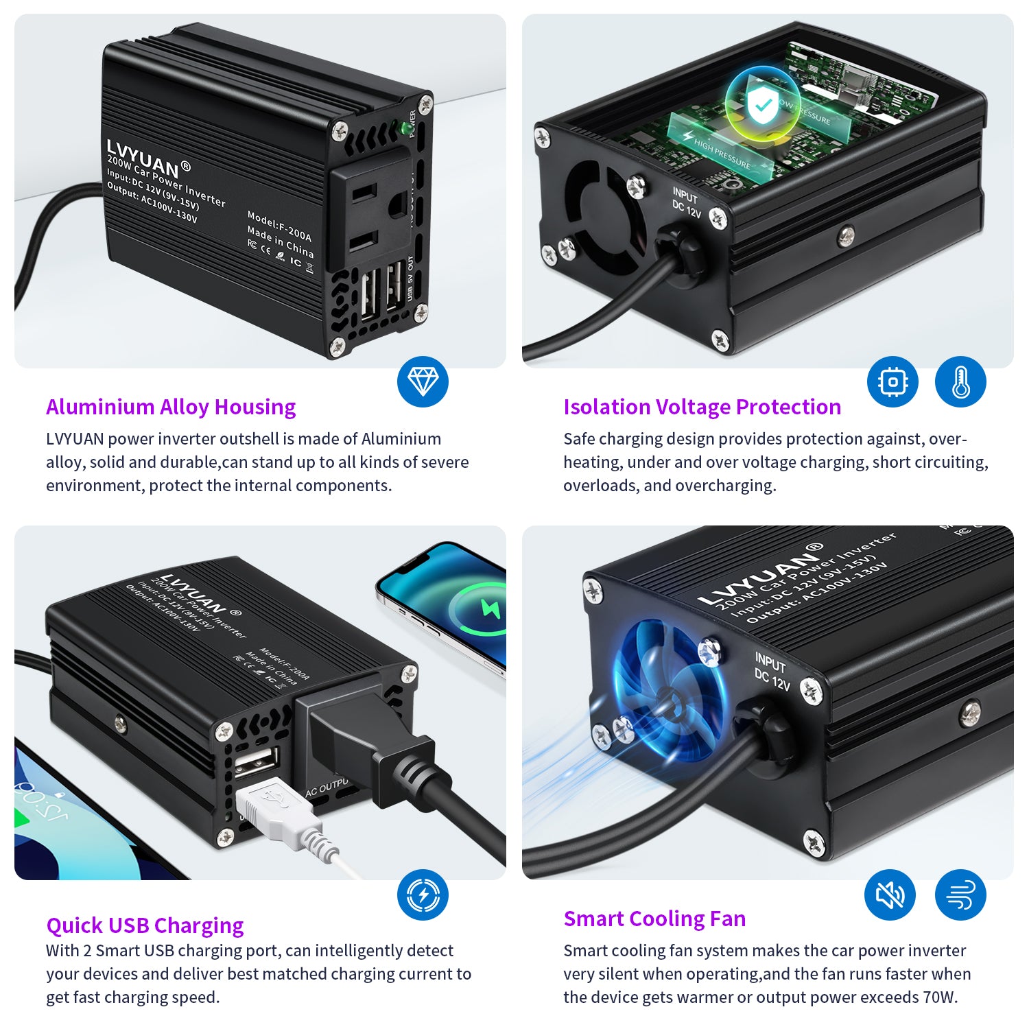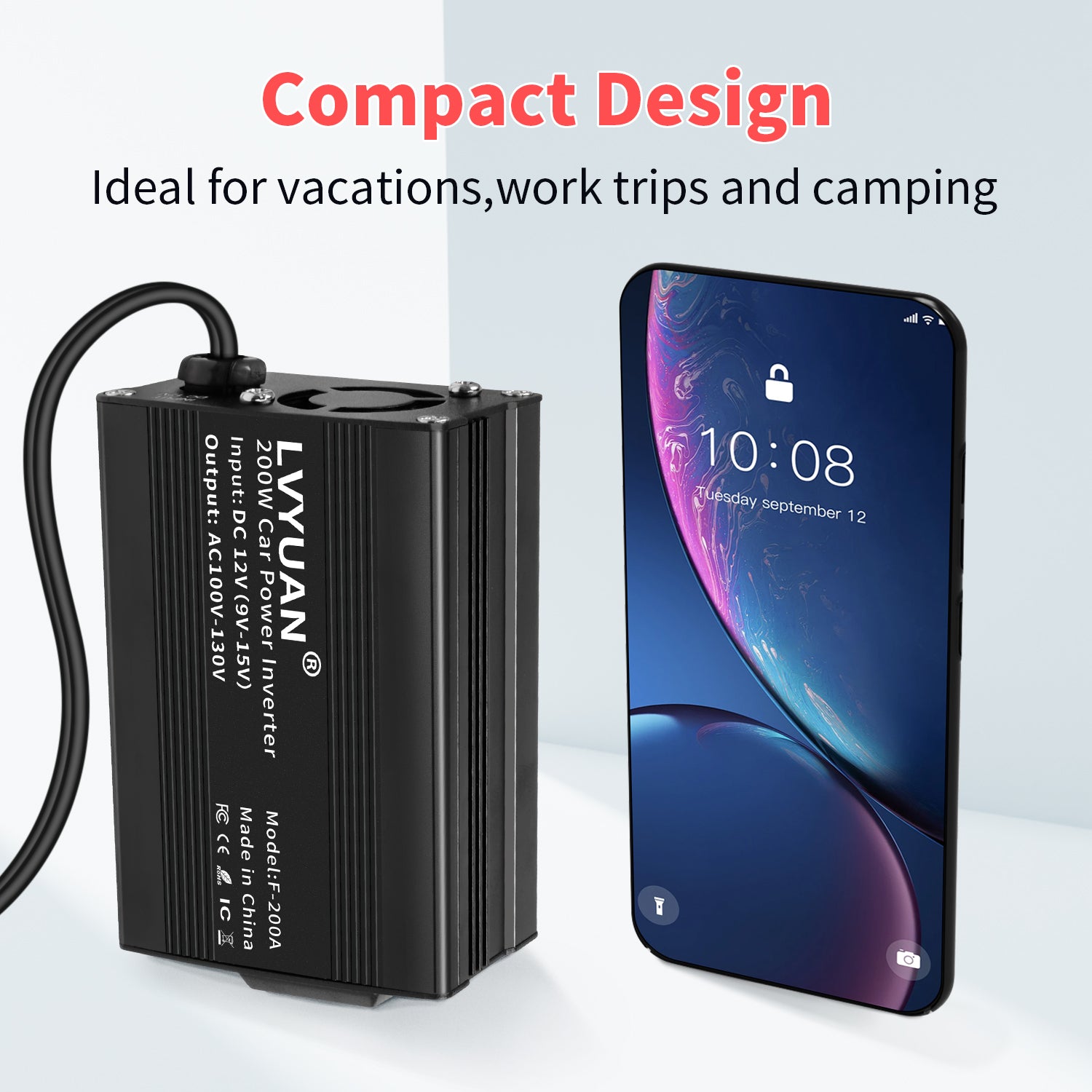 Powerful Charging: 200W rated power capacity with 1 AC outlet and 2 USB ports (Max 3.1A total output). Charge and power a wide range of devices in 90% conversion efficiency, from smartphones and tablets to laptops and gaming consoles. Safe & Reliable: Built-in protections against overheating, under/over voltage, short circuits, and overloads, ensuring safe charging for your devices. Smart monitoring with LED indicators shows power status and alerts you to potential issues, including automatic shut-off if input voltage drops below 10V or the unit overheats. Durable Metal Housing: Robust aluminum alloy construction with integrated cooling fan to prevent overheating and ensure long-lasting performance. The durable design protects the inverter from drops and bumps, making it ideal for daily use and travel. Travel-Friendly: Ideal for charging smartphones, tablets, laptops, breast pumps, CPAP machines, nebulizers, game consoles, Kindles, TVs, DVD players, lights, iPads, and other small electronics within 200W, making it perfect for road trips, vacations, and outdoor activities. Whether you’re on a long road trip or a quick errand run, this 200W inverter is the perfect solution for keeping your devices charged and ready to go. Easy to Use: Simply plug the 24-inch cigarette lighter plug into your vehicle’s 12V outlet and start powering your devices. The soft start technology ensures a gentle startup process, reducing strain on your vehicle’s battery. Compact & Portable Design: This inverter is just about credit card size - 3.34 x 2.4 x 1.45 inches, space-saving and easy storage.